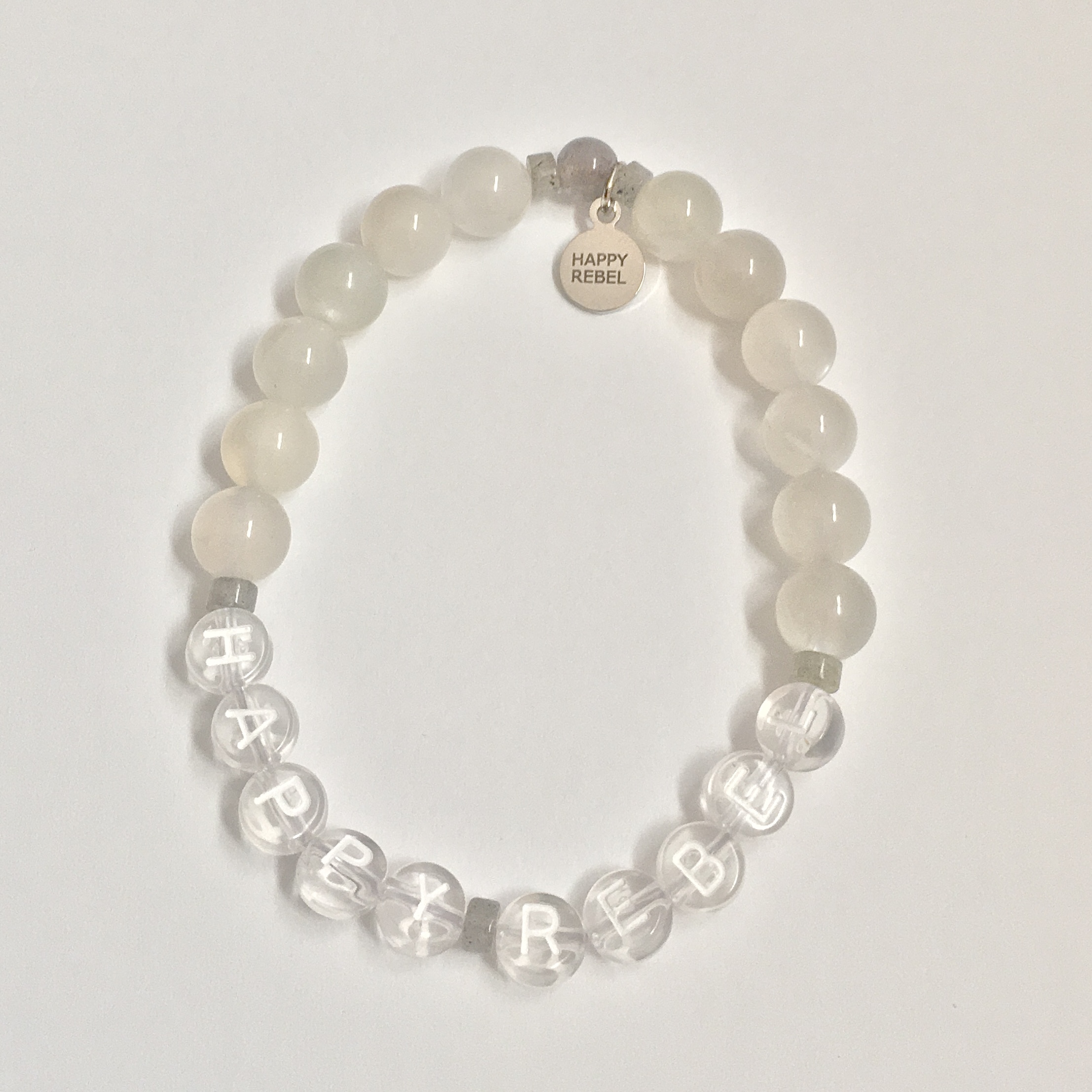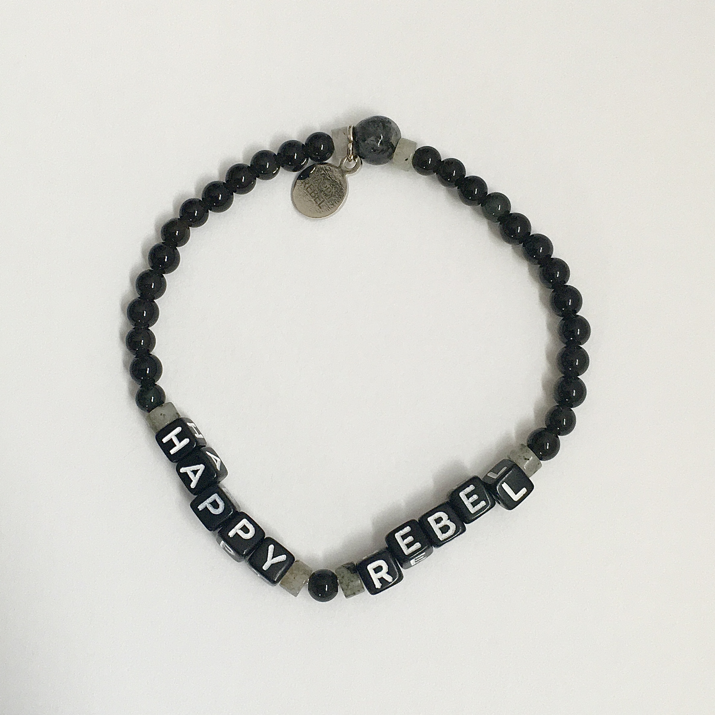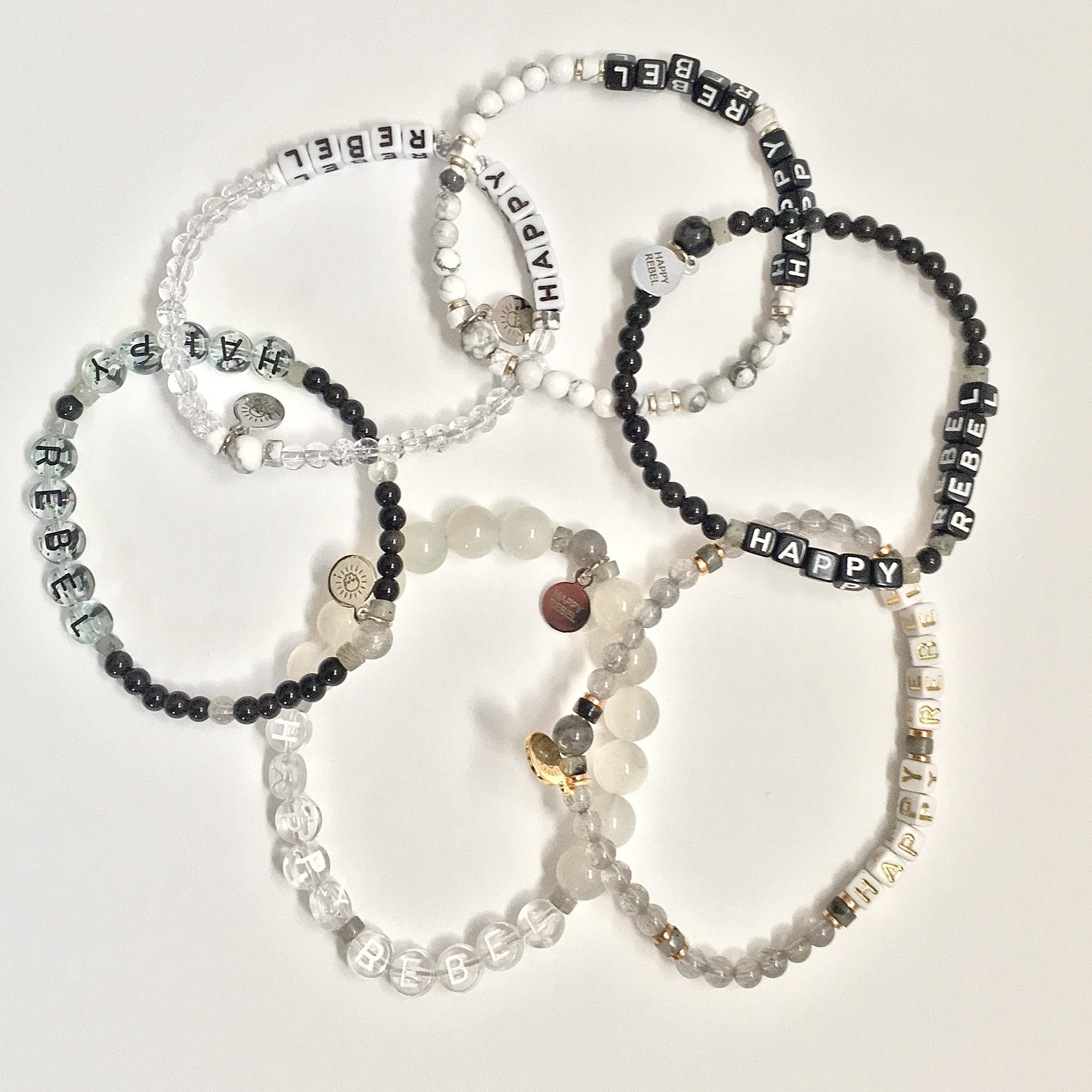 Show your Happy Rebel status with these sweet, stackable bracelets. All are made with natural gemstones, fun acrylic letter beads, and elastic bands for flexible fit and wear. These are one-of-a-kind exact styles, so each bracelet pictured is the one that you will receive!