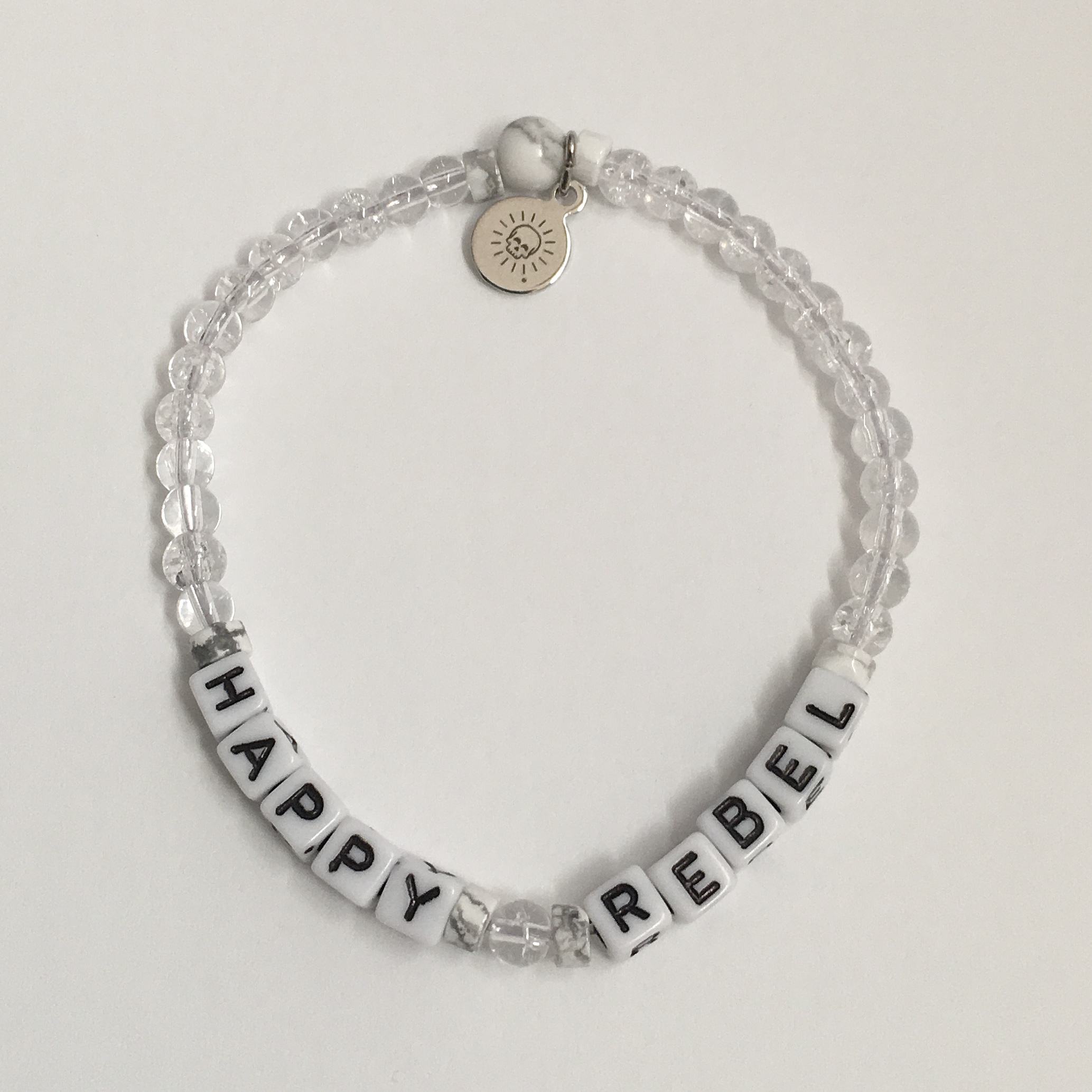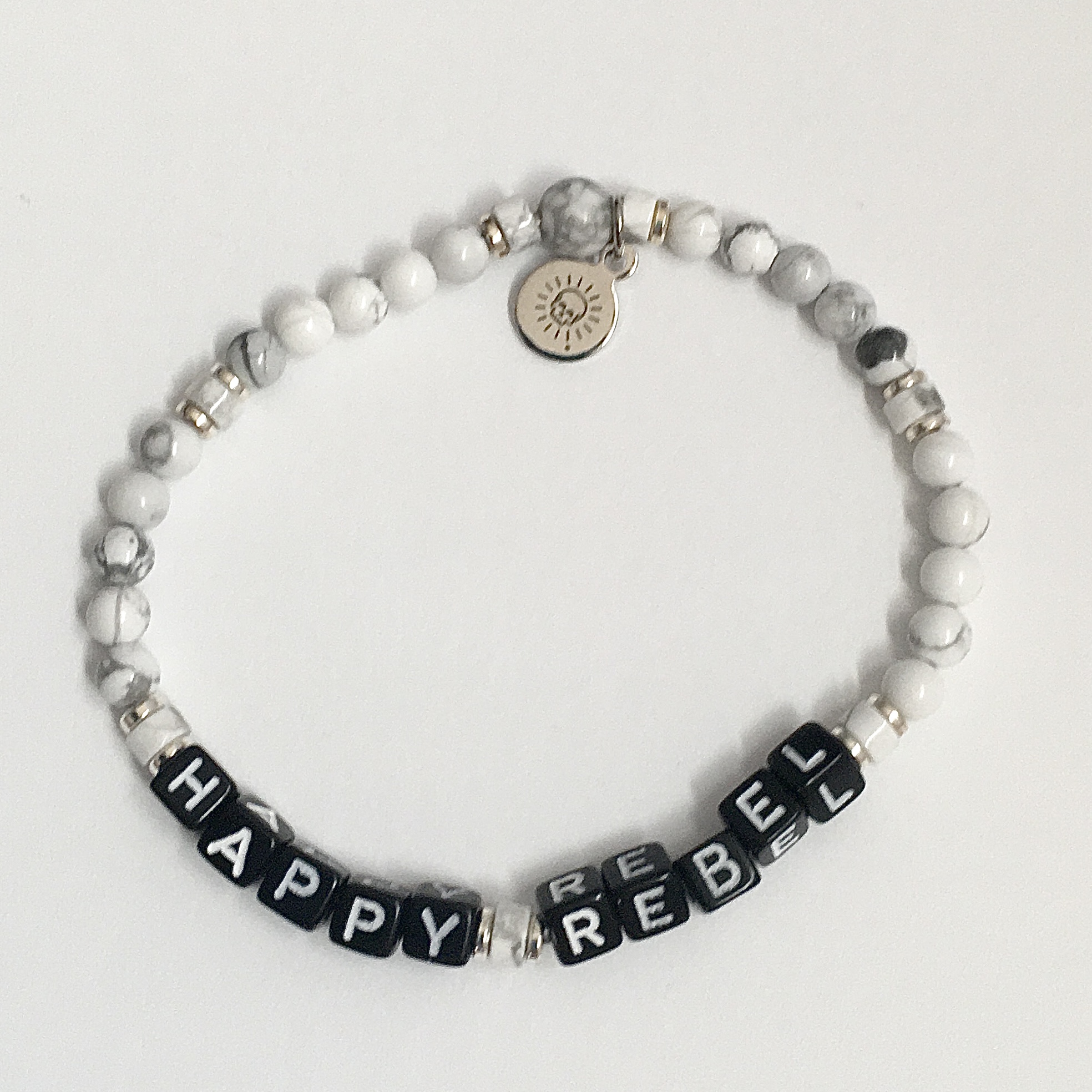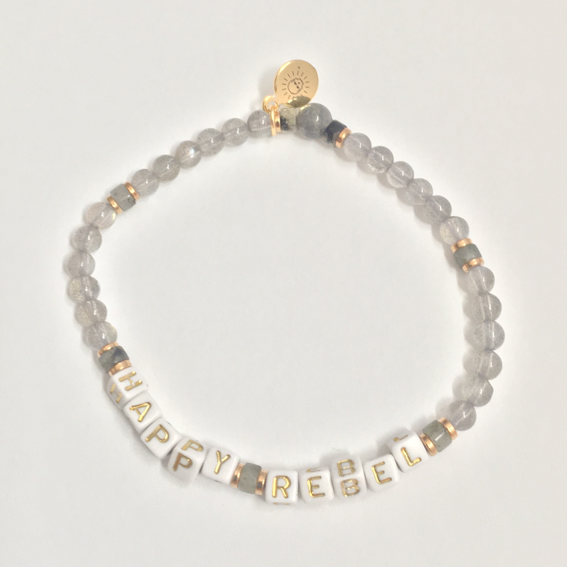 Show your Happy Rebel status with these sweet, stackable bracelets. All are made with natural gemstones, fun acrylic letter beads, and elastic bands for flexible fit and wear. These are one-of-a-kind exact styles, so each bracelet pictured is the one that you will receive!