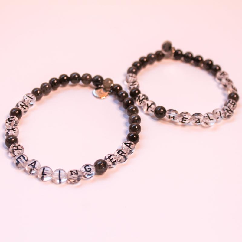 - Labradorite with black letter acrylic beads: Known as a stone of transformation and protection, Labradorite supports inner strength and intuition.