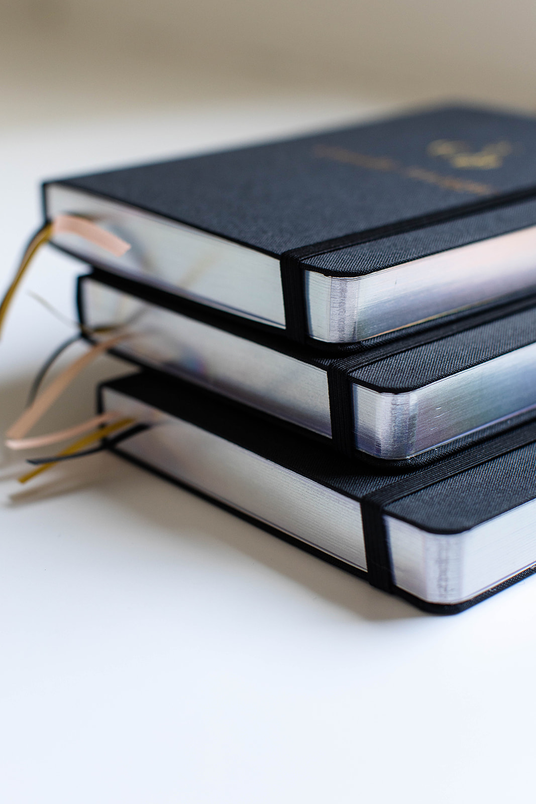 We hope you feel inspired to create some magic with our journals. Express your creativity and create a beautiful work of art in the ‘The Creation Journals.’ Crafted with eco-friendly bamboo paper, this luxurious dot grid journal notebook will never bleed or ghost the colors you use to design your masterpiece. With 160 iridescent-lined pages, a luxurious linen cover, a strap for closure, and a pen holder, as well as gold and silver foil décor, your journal will be as stylish as it is functional.